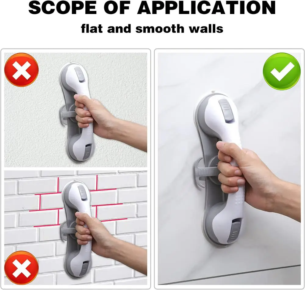 2.Important Tips -- This suction cup handle device must be applied on non-porous, texture-free, dry, clean, flat and smooth surfaces, such as dry tile, smooth glass.Clean and dry surfaces thoroughly before installation to ensure smooth, non-porous surfaces.Please check the stability of the suction cup periodically and test the suction before using it. This grab bar is to be used only to assist and help supporting a person's body properly, not to stand full body weight.
