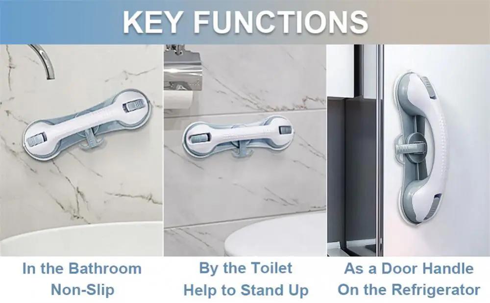 1.Sturdy & Durable -- The shower grab bar is made of ABS plastic, 3 suction cups that more strong power than other 2 suction cups item, very sturdy and durable. You won't slip even when the floor is wet, providing comfortable and relieved experience in bathroom, shower, tub and toilet handrail.